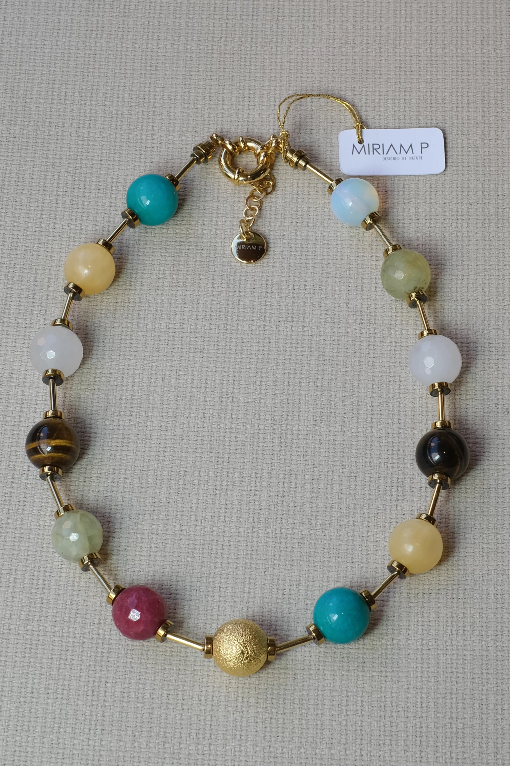 Um tributo à energia criativa e cosmopolita do LX Factory, reduto de design, moda e arte contemporânea em Lisboa. O Colar Lx Boutique combina a elegância atemporal das pedras naturais — jade, calcita, olho de tigre, quartzo rubi, quartzo branco e quartzo rutilado verde — com detalhes exclusivos em cubos banhados a ouro e hematitas douradas, criando um equilíbrio perfeito entre sofisticação e ousadia.